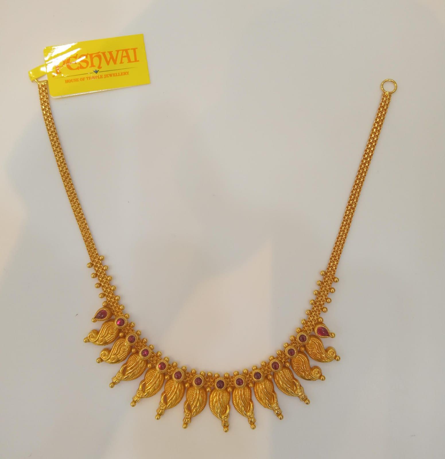 This is a beautifully crafted traditional gold necklace featuring an elegant leaf (paisley) drop design. The necklace has detailed gold carvings with small gold bead accents along the edges, giving it a rich and royal look.