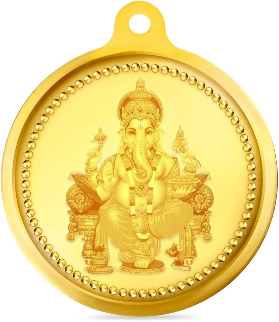 This 24K fine gold coin features an embossed image of Lord Ganesha, symbolizing prosperity, wisdom, and new beginnings. The coin has a radiant mirror polish finish that enhances its visual appeal. Encased in a tamper-proof transparent box, it ensures safety and presentation, making it an excellent choice for both gifting and investment.