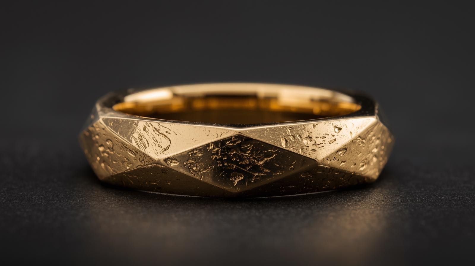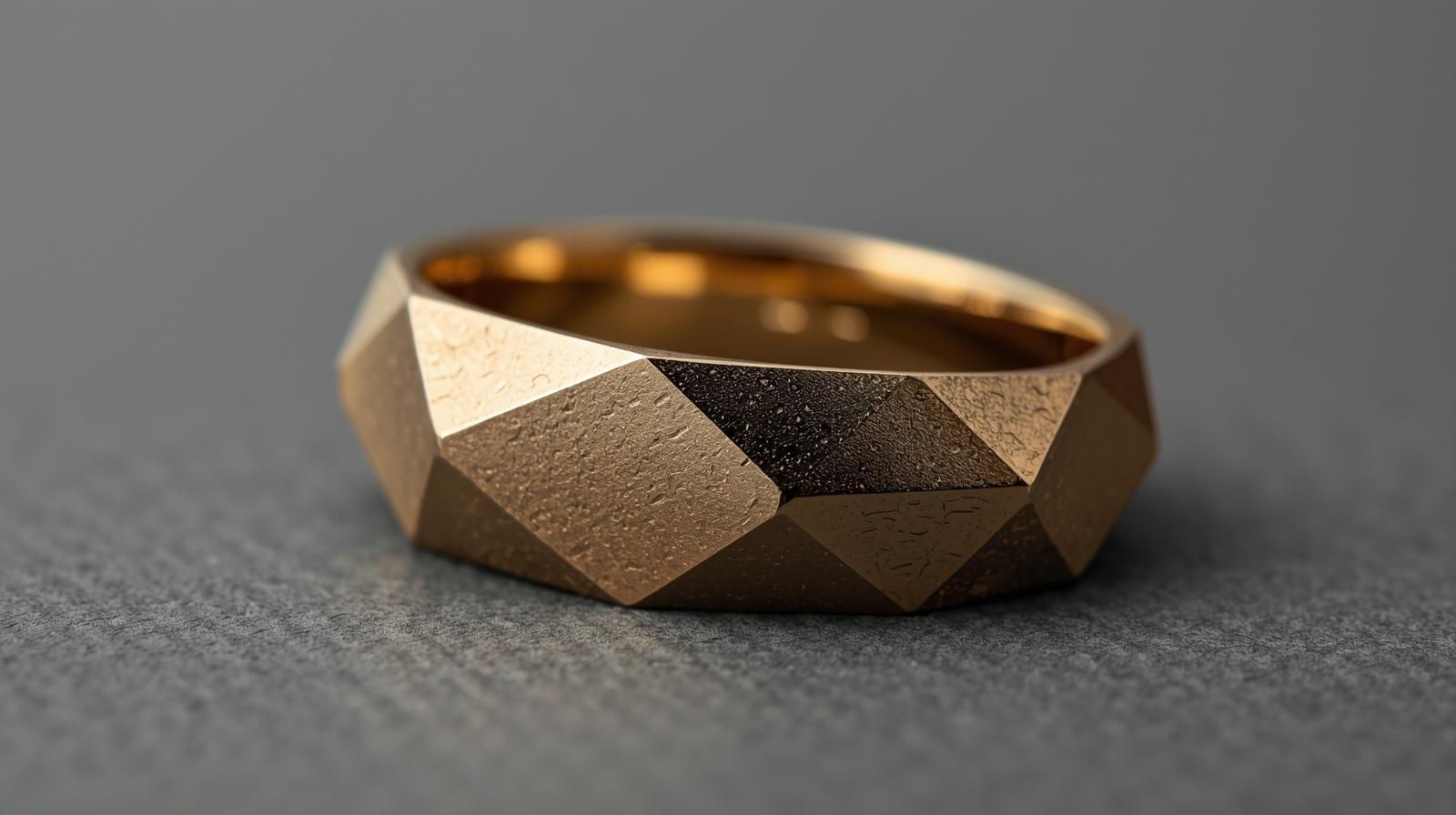 A bold and contemporary men's band crafted from luxurious 22K yellow gold. Its defining feature is its striking geometric, faceted design, which creates a modern, architectural aesthetic. The surface is finished with a sophisticated matte or satin texture, providing a tactile, non-reflective contrast to the highly polished edges that define each facet. This substantial, weighty ring is designed for the man who appreciates unique, statement-making jewelry with a minimalist yet powerful presence.