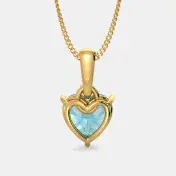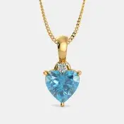 A delicate and romantic pendant designed to express love. It features a stunning heart-shaped aquamarine as its centerpiece, symbolizing clarity and serenity. The stone is elegantly held in a 22K yellow gold setting with four prongs, which are adorned with small accent diamonds at the top and bottom, adding a touch of brilliance. The pendant is suspended from a classic, high-polish snake chain, making it perfect for everyday wear or special occasions.