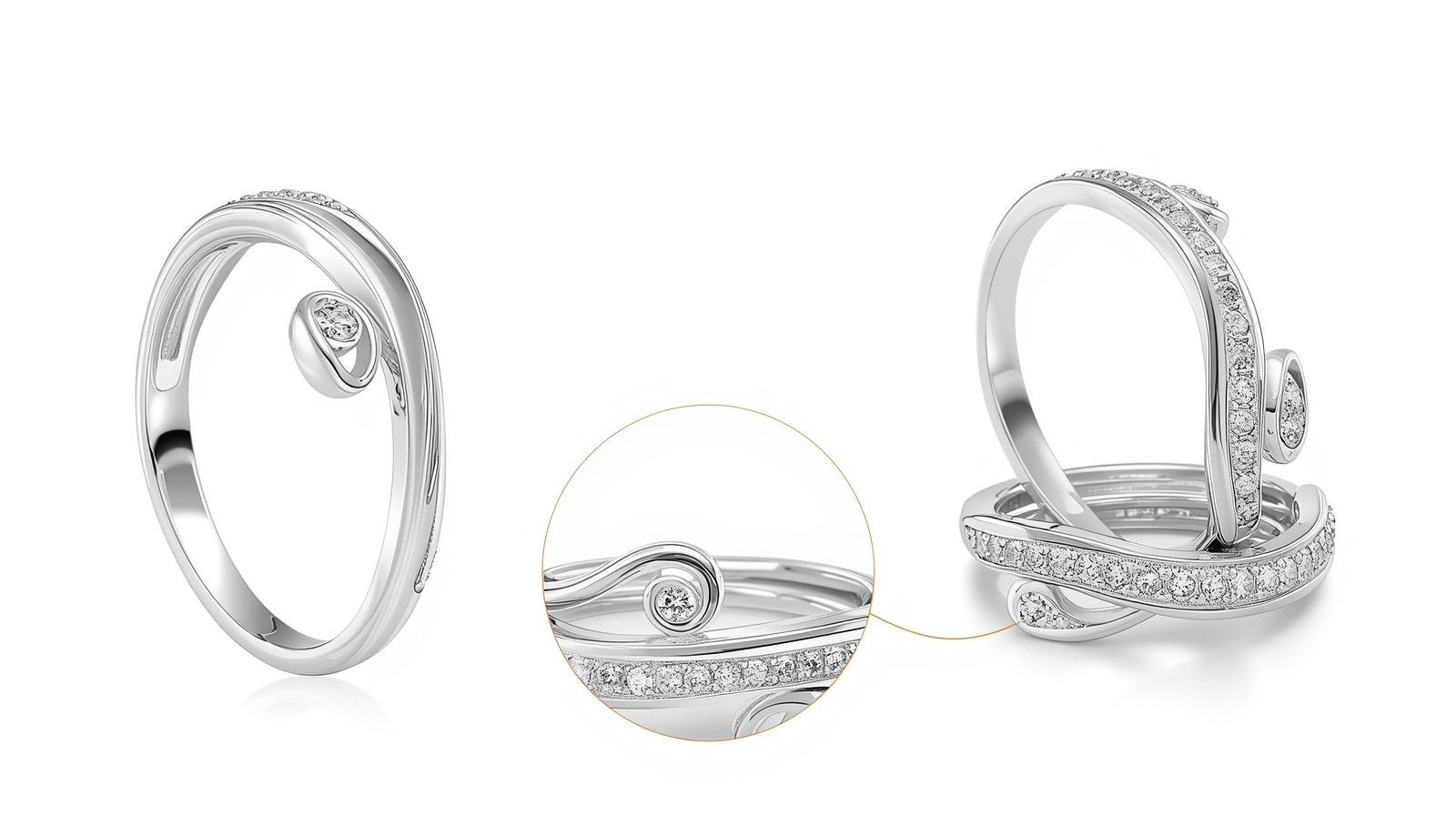 A modern and elegant ring designed for stacking or as a standalone statement piece. It features a unique, flowing swirl that interlocks with itself, creating a dynamic and romantic silhouette. The entire band is adorned with micro-pavé diamonds, while a larger round brilliant diamond is set at the heart of the swirl, adding a focal point of brilliance. Crafted in high-polish white gold, it is perfect for engagement, anniversary, or everyday luxury.