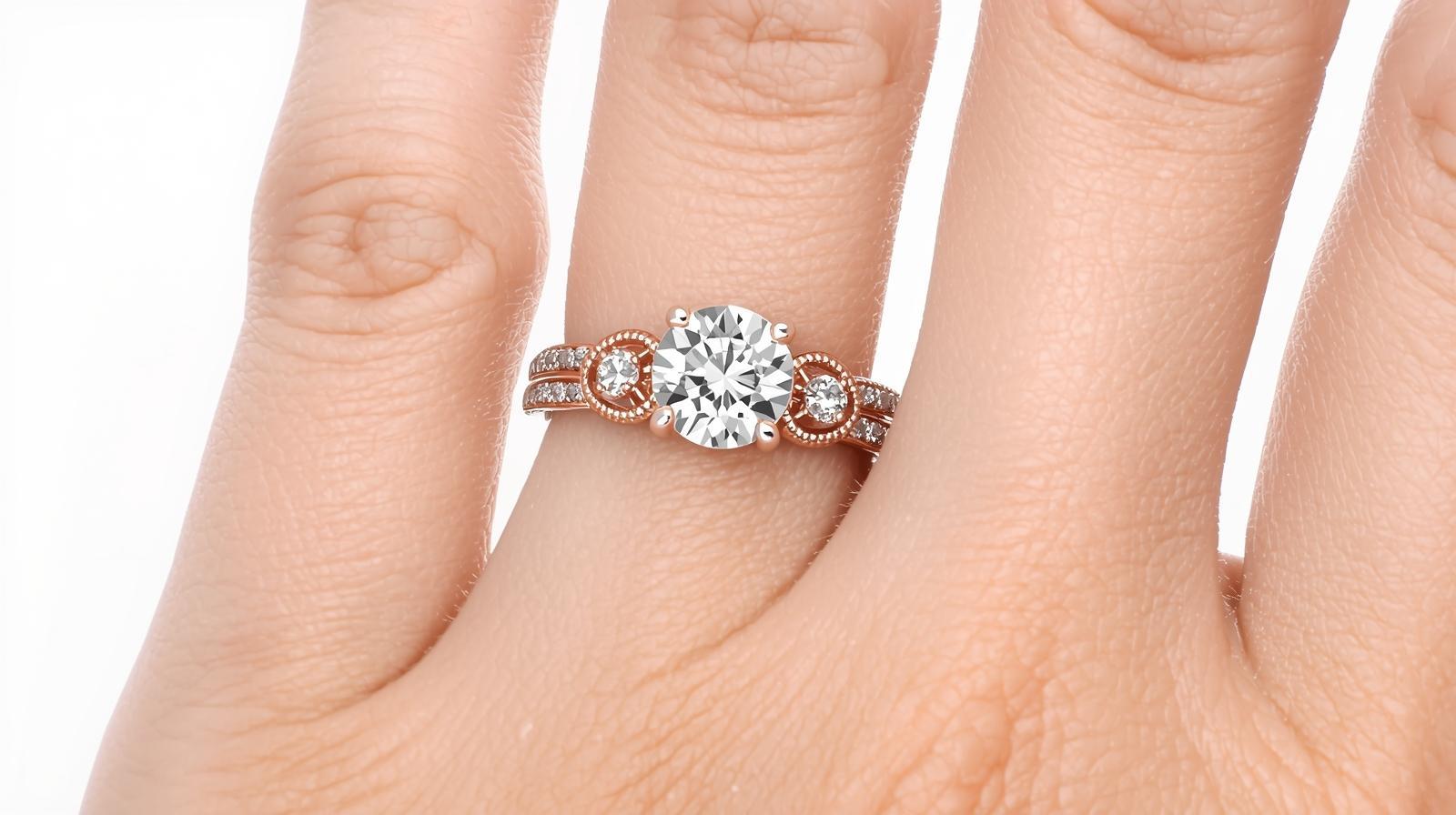 A sophisticated and luxurious three-stone ring designed for maximum impact. Crafted in warm 14K rose gold, it showcases a large, sparkling central round diamond. This is flanked on either side by a smaller, equally brilliant diamond, each nestled within its own intricate halo of micro-pavé diamonds, creating a dazzling, multi-faceted effect. The band itself is a work of art, featuring a layered or multi-strand design that is also adorned with pavé-set diamonds, adding depth and brilliance. This ring is a statement piece that combines traditional symbolism with modern, opulent design.